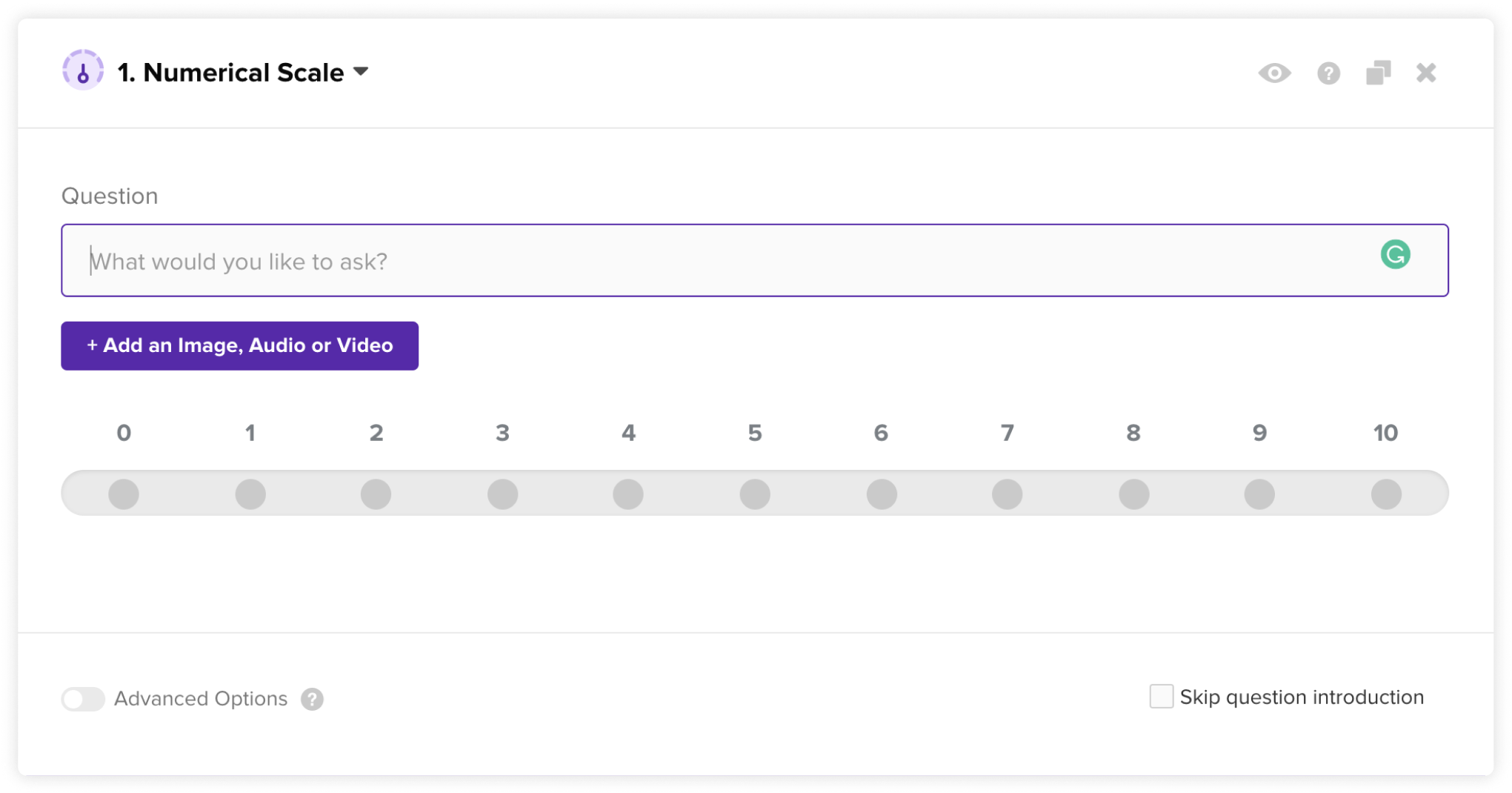 Numerical scale questions evaluate how your customers feel about a specific element, idea, or item. This question type is very useful if you want to focus a customer reaction around a very specific perspective, such as ease of use, likelihood, or a feeling.